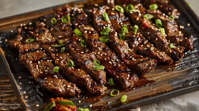 Beef bulgogi is een van de populairste Koreaanse rundvlees gerechten. Heerlijk gemarineerde, geroosterd rundvlees in een bedje van sla.